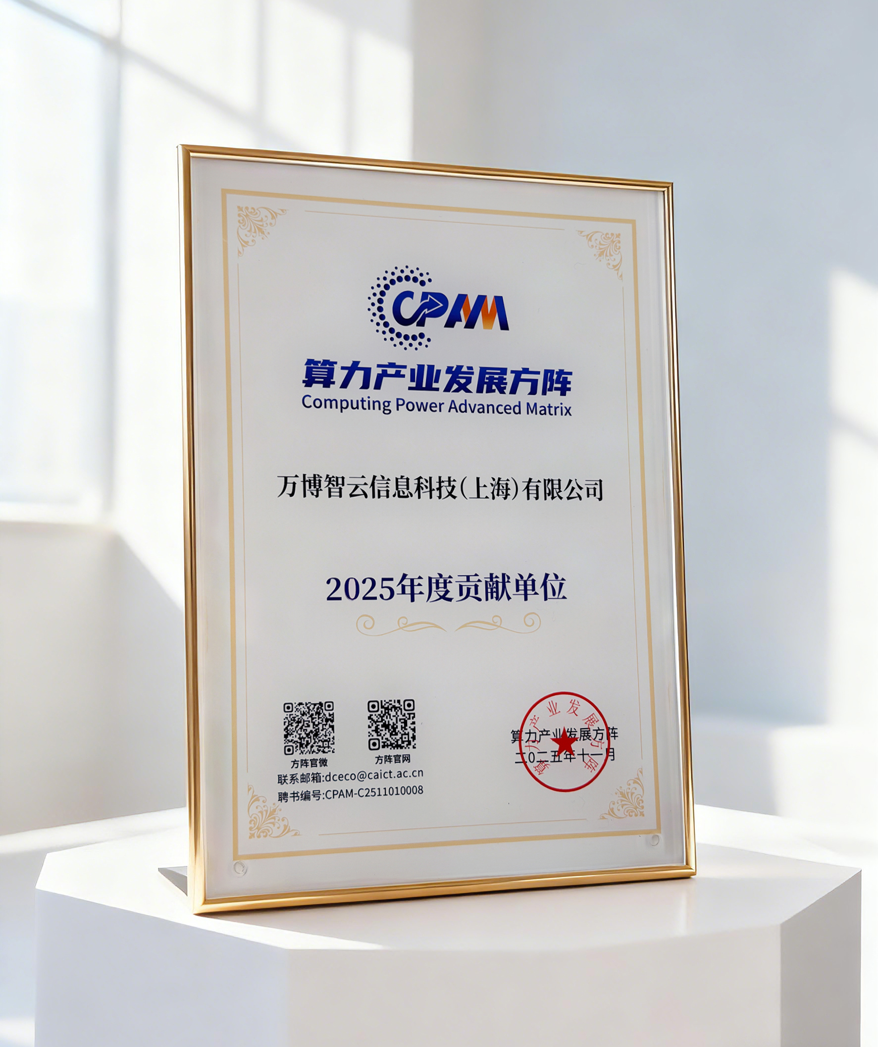 在本届华彩论坛上,算力产业发展方阵公布了 2025 年“年度贡献单位”名单,万博智云凭借在算力产品研发、算力生态建设及行业推广等方面的持续投入与实际成果,获评“年度贡献单位”。